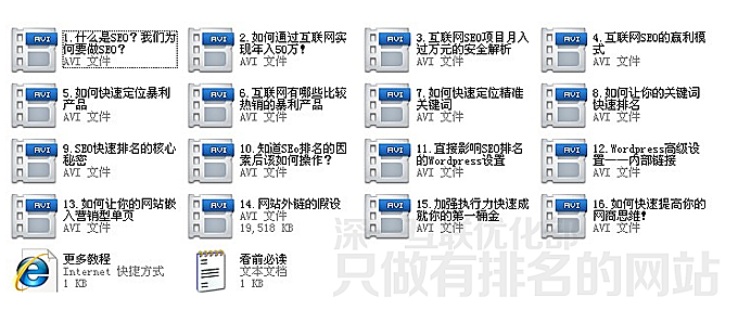 本套深一SEO視頻培訓(xùn)課程包括20部高清視頻+清晰語音+整齊的文本條目,手把手教會快速從主流搜索引擎上獲得排名,從而獲得無限網(wǎng)絡(luò)商機(jī)。