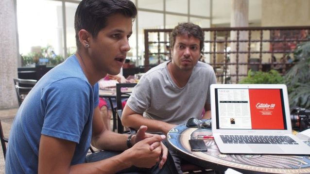 《Vistar》興辦者兼構思總監羅賓·佩德拉加(左)和他的兄弟、AlaMesa聯合創始人揚戴爾·古鐵雷斯。《Vistar》是有關古巴年青人文明的電子雜志,AlaMesa是有關古巴飯館的網站和移動運用。