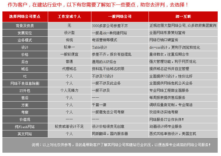 目前的網(wǎng)絡(luò)公司多如牛毛,大公司、小公司、個(gè)人工作室、或者是個(gè)人,都在進(jìn)行著傳統(tǒng)建站業(yè)務(wù),作為企事業(yè)單位如果有這種需求,這時(shí)就要擦亮眼睛了,不同的公司,自然他們的報(bào)價(jià)會(huì)有所不同,那么究竟怎樣從茫茫大海中找到合適的網(wǎng)絡(luò)公司呢?